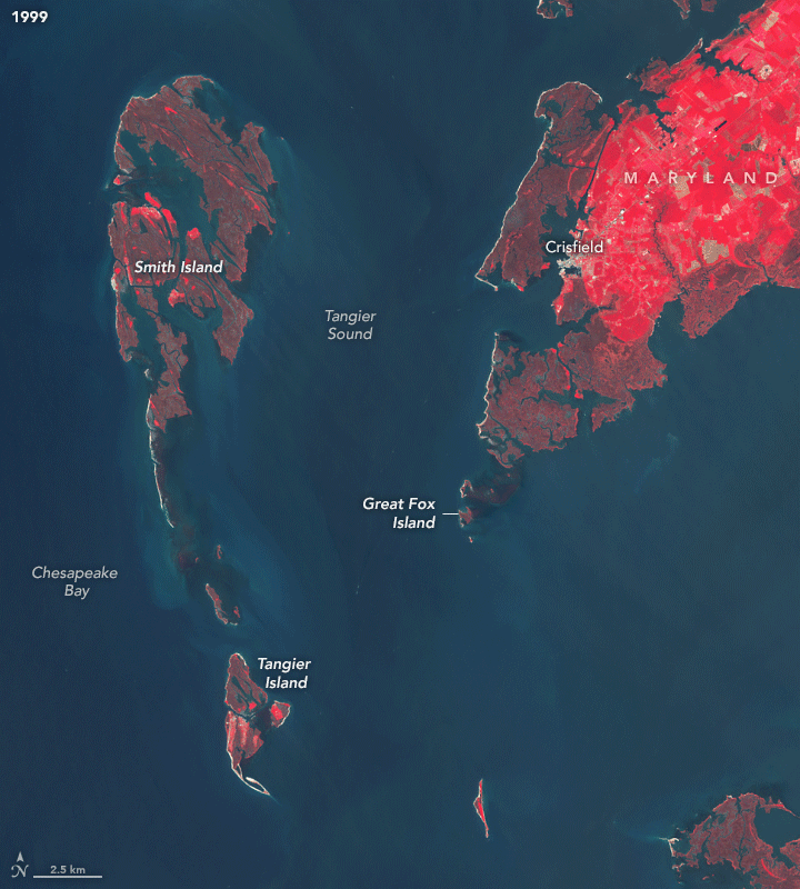 Анимация, демонстрирующая исчезновение островов Чесапикского залива Источник: NASA Earth Observatory images by Lauren Dauphin, using Landsat data from the U.S. Geological Survey