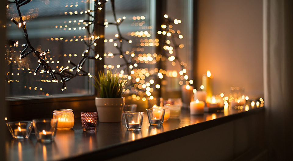 Если вам хочется оставить окно чистым и не загораживать обзор разным декором на стекле, можно обустроить красивую композицию на подоконнике. Для удобства можно взять красивый поднос, на котором разместить праздничные атрибуты: веточки елки и калины, шишки, свечи, фонарики, статуэтки ангелов, эльфов, оленей или снеговиков и т.д.