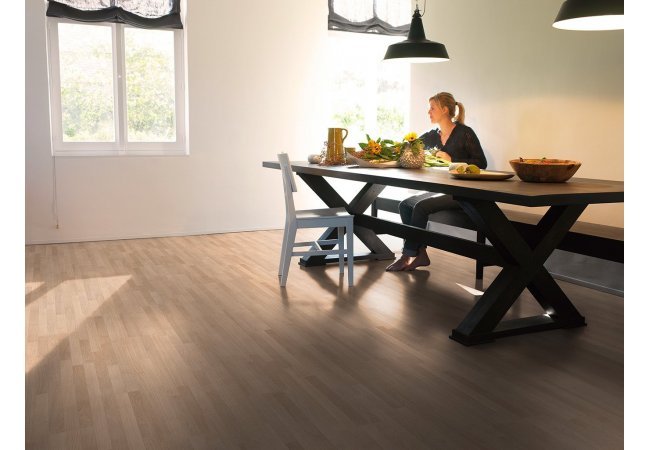 Как это не покажется странным, но специалисты утверждают, что на кухне допустимо класть деревянный паркет. Правда подойдут только твердые, с плотными волокнами породы древесины, такие как дуб, канадский клен, мербау, кемпас и ярра. Для увеличения износостойкости древесные изделия обрабатывают специальным составом из растительного масла и пчелиного воска. Кроме всего прочего такая обработка позволяет паркету успешно отторгать воду и грязь. Единственное предостережение – покрытие из клена не переносит теплых полов (с подогревом). Комбинированный вариант предполагает оснащать кухонную зону плиткой, а столовую область паркетом. Отдельным видом выступает бамбуковый паркет, обладающий хорошей водостойкостью. К сожалению, его невозможно шлифовать, а время службы, увы, ограничено 8 годами.