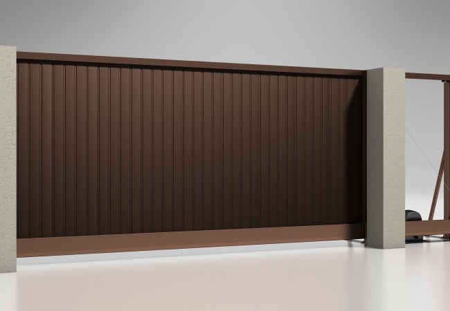 Откатные ворота сконструированы из железного каркаса, в результате на который обкладывается разного рода материал обшивки, к примеру, кованный, металлический, и деревянный. Все же часто обшивкой ворот с откатным вариантом работы служит профнастил, так как его использование очень эффективно и практично, ведь листы профнастила весьма выносливы при сравнительно невесомом весе, а еще он располагает огромнейшим выбором цветовой палитры, что дает возможность применять профнастил в широком спектре мыслей дизайнера.