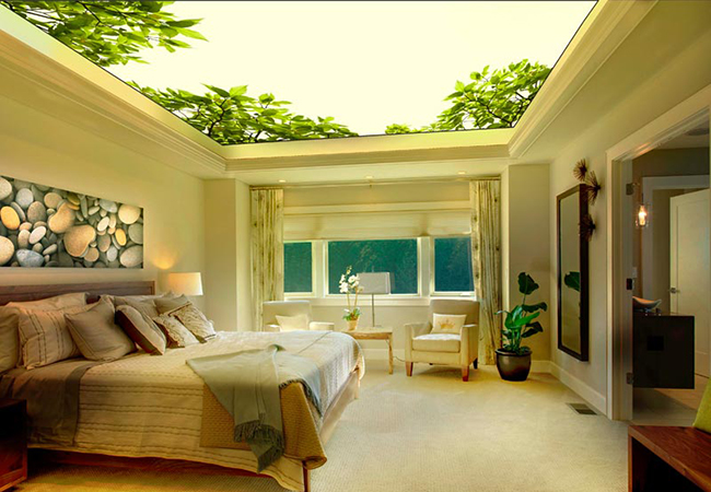 Часто потолок мансарды плавно переходит в стены и тогда становятся единым потолочным пространством. В этом случае можно воспользоваться возможностями фотопечати с цветочными или растительными орнаментами, пейзажами, можно сделать мансарду в виде панорамы.