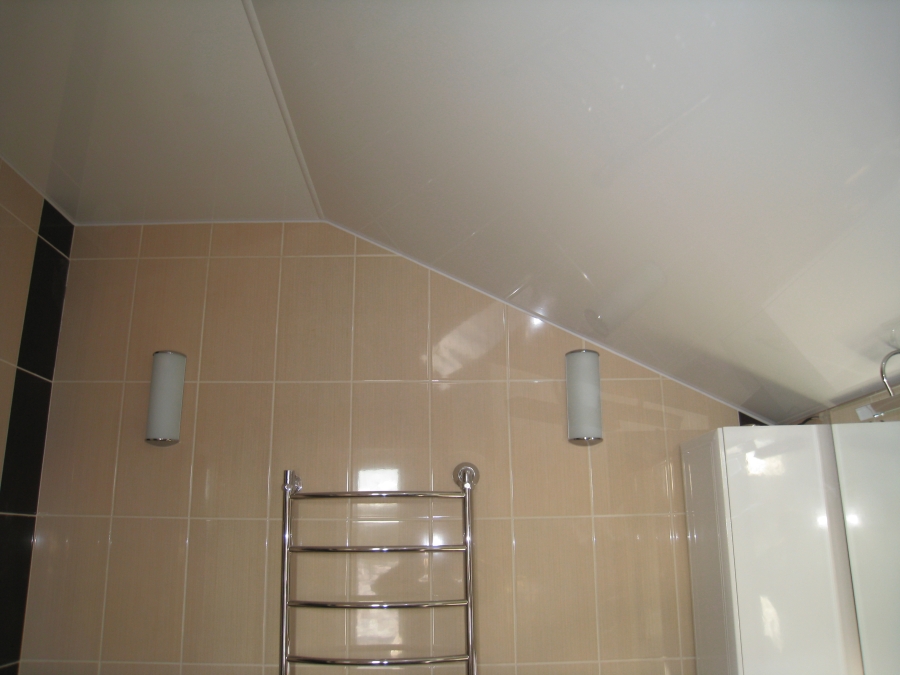 Потолок на мансарде может быть совсем небольшим и располагаться только в верхней части помещения. В этом случае рекомендуется выбирать цвет, который гармонировать бы со стенами и полом. Обычно это светлые цветовые решения, они увеличивают пространство.