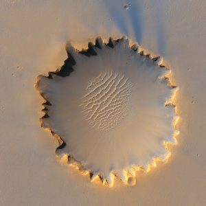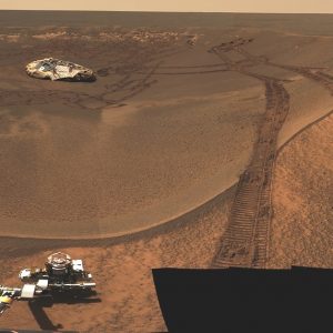 Opportunity прибыл на Марс 25 января 2004 г. Его посадочная платформа опустилась в небольшой 22-метровый кратер Игл (Eagle), расположенный на Полуденном плато. Впоследствии анализ собранных мобильной лабораторией данных помог установить, что в далеком прошлом вся эта территория, скорее всего, была морским дном.