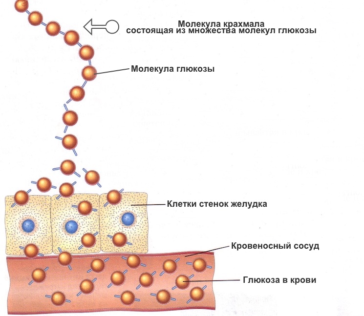 Через стенки кишечника глюкоза всасывается через в кровь, а затем с кровью попадает в печень, где и хранится как «топливо», из которого клетки по мере надобности высвобождает энергию.