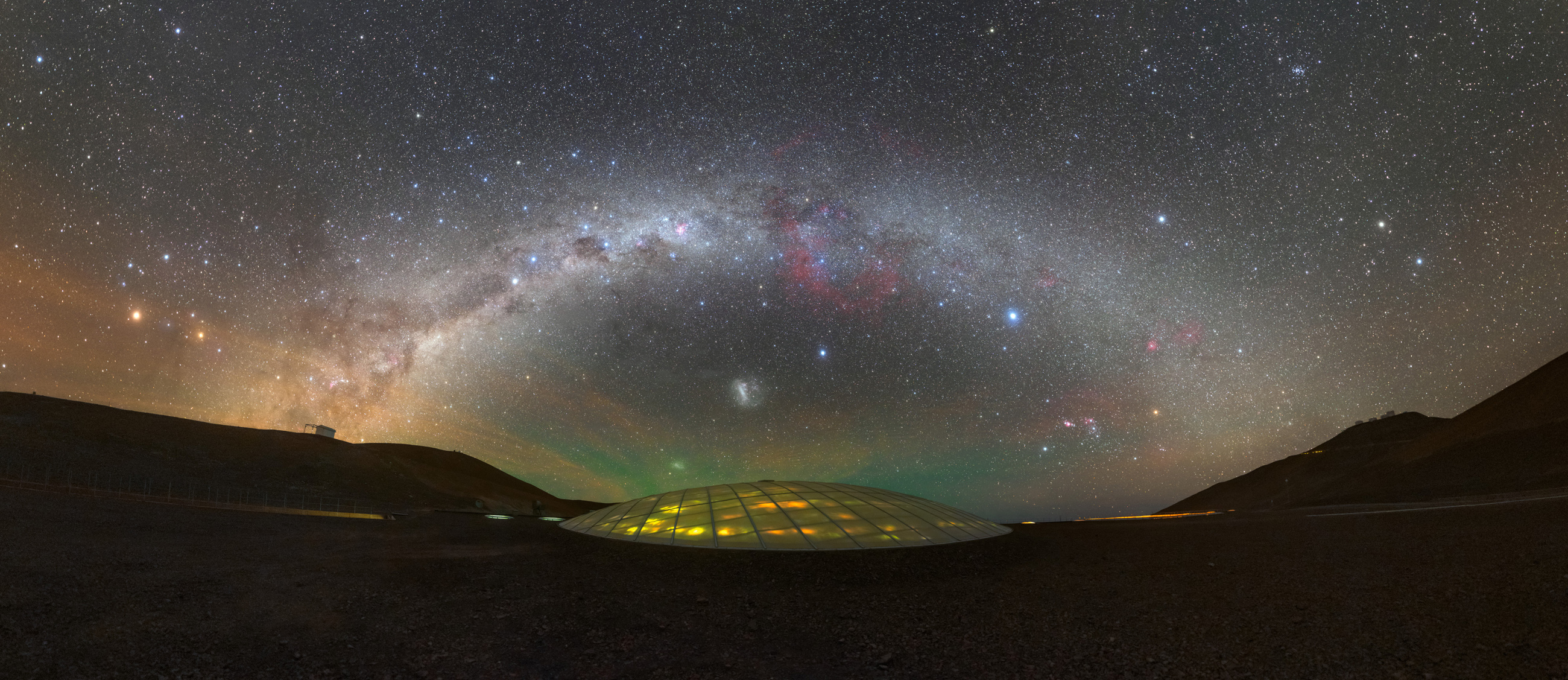 В небе над куполом можно увидеть великолепную полосу Млечного Пути. Если присмотреться, под его аркой в виде светлых пятен различимы также два наших «соседа» — карликовые галактики Большое и Малое Магеллановы облака.