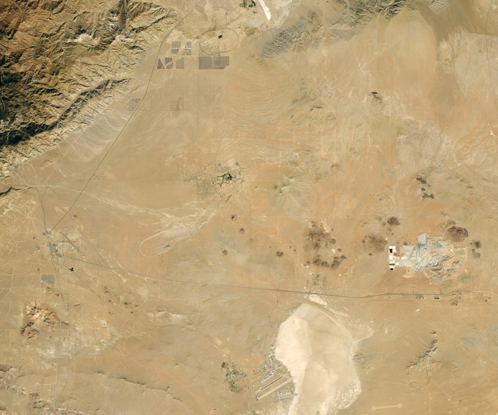 Представленный снимок был сделан 18 октября 2018 г. спутником Landsat 8. На фото запечатлена авиабаза Эдвардс и расположенный на ее территории Летно-исследовательский центр NASA. В 2014 г. ему было присвоено имя Нейла Армстронга (Neil Armstrong).