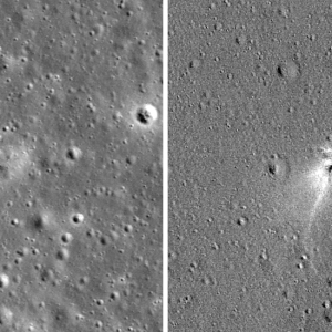 Изображения LRO демонстрируют светлую область, которой не было в этом регионе еще в конце марта 2019 г. В ее центре можно увидеть темное пятно. Это место удара зонда «Берешит». От светлой области отходят лучи протяженностью до 100 м. Скорее всего, они образовались в результате разлета обломков аппарата.