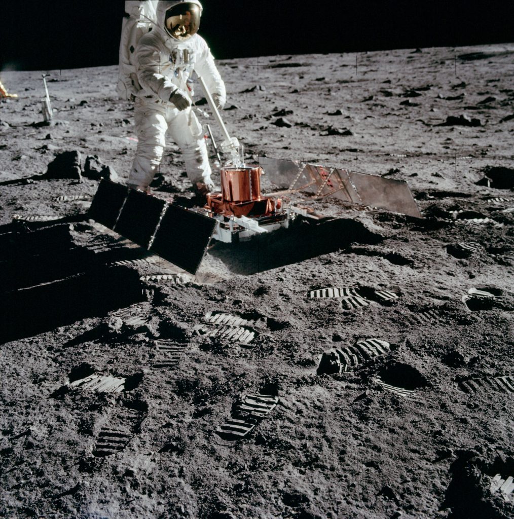 Астронавт экспедиции Apollo устанавливает сейсмограф на лунную поверхность. Источник: NASA
