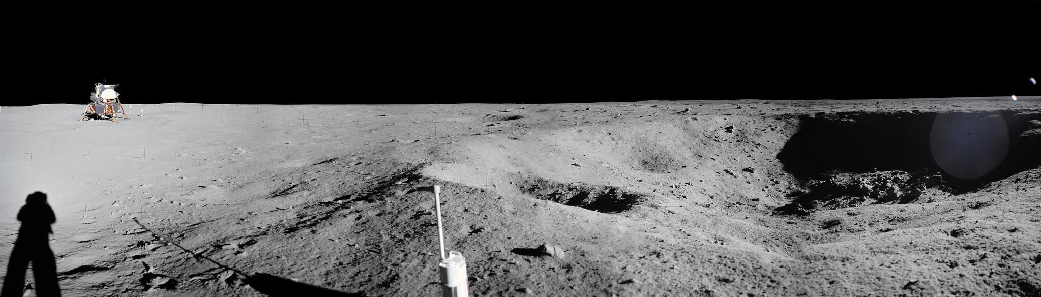 Панорама места посадки Apollo 11. В кадре можно увидеть лунный модуль, тень Нила Армстронга и кратер Little West. Источник: NASA