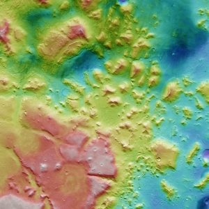 Если присмотреться к топографической карте Nili Fossae (слева показан юг, справа — север), нетрудно заметить, что рельеф региона соответствует общей дихотомии Марса: его южная часть существенно выше, чем северная.