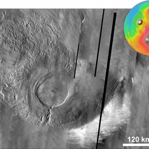 Мозаичное изображение Горы Арсия, составленное из снимком станции Mars Odyssey. На врезка показано расположение вулкана на топографической карте Марса. Источник: NASA / JPL-Caltech / Arizona State University