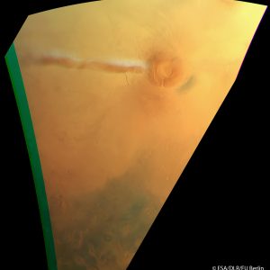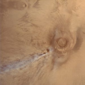 На протяжении вот уже полутора месяцев европейский зонд Mars Express ведет наблюдение за необычным облаком, которое, словно шлейф от извержения, тянется от вершины марсианского супервулкана Гора Арсия (Arsia Mons). Его максимальная протяженность достигает 1500 км. Для сравнения: диаметр основания Горы Арсия составляет 430 км, высота — около 20 км.