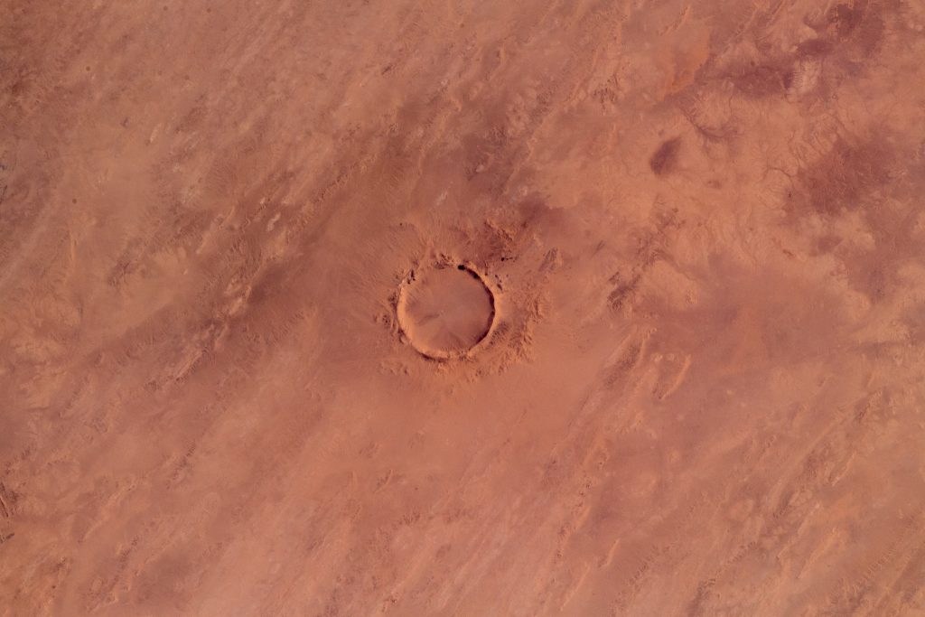При взгляде на представленные фотографии может показаться, что на них запечатлен один из бесчисленных марсианских кратеров. Но на самом деле это вовсе не Марс, а наша Земля. На снимках, сделанных с борта МКС астронавтом Александром Герстом (Alexander Gerst), виден кратер Тенумер, расположенный на территории Мавритании в пустыне Сахара.