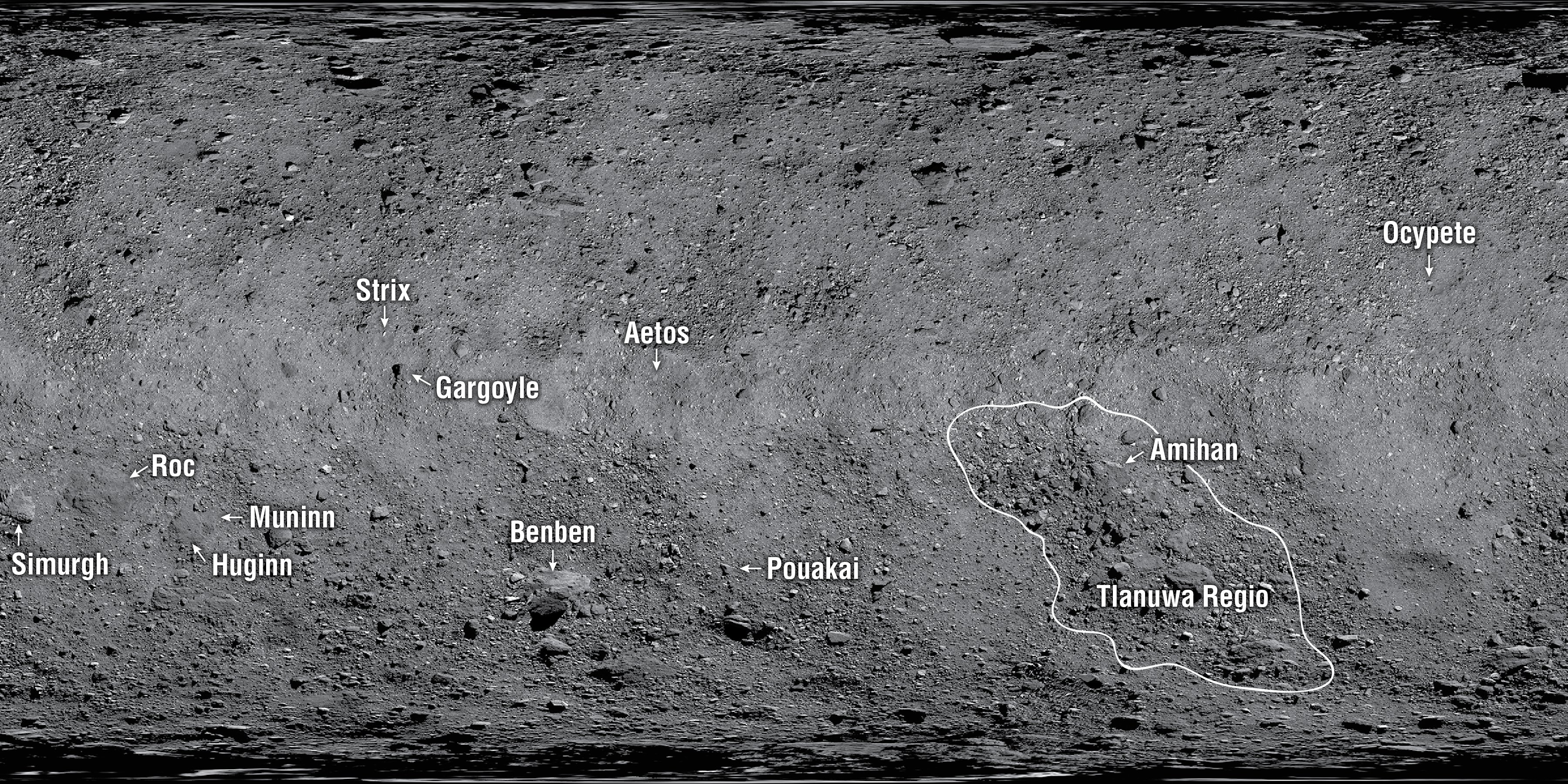 Собственных названий удостоились 11 больших валунов на поверхности Бенну и покрытый камнями регион, расположенный в его южном полушарии. Отныне на астероиде можно
