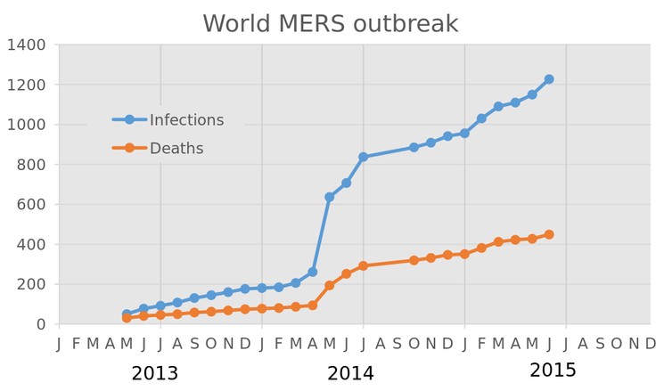 Генеральным директором ВОЗ доктором Маргарет Чен были высказаны опасения, что новый коронавирус имеет способности распространяться быстрее, чем могут быть найдены возможности и эффективные методы борьбы с ним. По последним данным на лето 2015 года лабораторно были подтверждены уже 64 случая заражения Ближневосточным респираторным коронавирусным синдромом. Из них было зафиксировано 38 летальных исходов. Инфицированными оказались жители Германии, Саудовской Аравии, Франции, Италии, Туниса, ОАЭ, Великобритании, Иордании, Катара. Как видно, смертность от MERS CoV довольно высока.