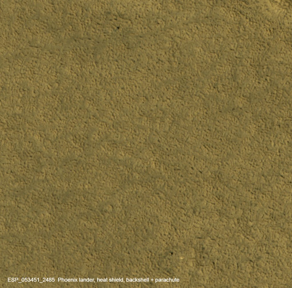 Первый снимок был сделан 20 июля 2008 г. На нем можно разглядеть три темных пятна. Верхнее пятно — место посадки Phoenix. Точка в центре это сам аппарат. Пятно в правой центральной части осталось от падения теплозащитного экрана. В нижней части снимка можно увидеть тормозной парашют.
