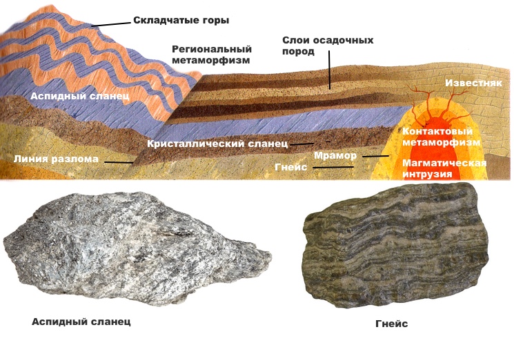 В результате образования складчатых гор слева от линии разлома накопились мощные слои пород, сдавленные таким образом, что минеральные зерна изменили направление залеганий и глинистый сланец превратился в аспидный. Наиболее глубокие и сильно нагретые слои глинистого и аспидного сланцев превратились в в кристаллический сланец и гнейс. На рисунке показана магматическая интрузия, которая «спекла» окружающие породы, вызвав контактный метаморфизм, в результате которого известняк превратился в мрамор.
