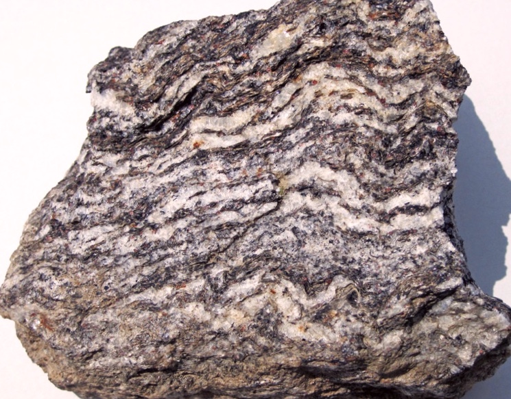 Кристаллический сланец образовался в результате регионального метаморфизма. Кристаллы слюды выроснялись под высоким давлением. Некоторая часть слюды в этом образце сланца из Австрийских Альп превратилась в гранат.