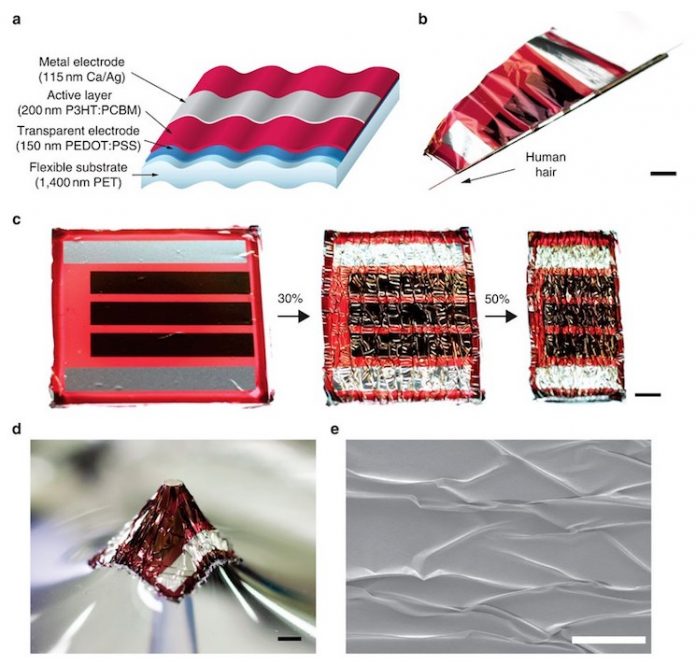 Для того, что бы показать гибкость структуры, провели занимательную демонстрацию – обернули образец вокруг человеческого волоса, полученный радиус сгиба составил всего 35 мкм. И пусть на данный момент органические солнечные аккумуляторы не могут достичь такой же эффективности, как кремниевые собратья, однако их положительные стороны делают их перспективными.