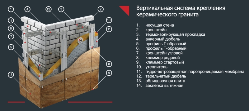 Следующий слой состоит из теплоизоляционных материалов, которые, как правило, обладают водоотталкивающими свойствами. И наконец, третьим слоем, который обустраивается на определенном расстоянии от теплоизоляции, является так называемый защитный экран, являющийся одновременно и декоративной облицовкой фасада. Фиксируется он непосредственно к несущему слою с помощью точечных анкеров. Благодаря анкерам, в зависимости от их длины, можно регулировать расстояние от защитного экрана до теплоизоляционного слоя.