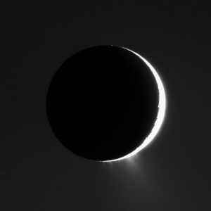 Энцелад на фоне кольца Е. Источник: NASA/JPL-Caltech