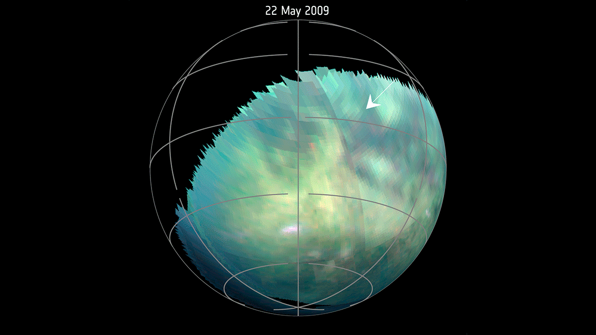 Анимация, показывающая яркие пятна в экваториальных областях Титана. Источник: NASA/JPL-Caltech/University of Arizona/University Paris Diderot/IPGP/S. Rodriguez et al. 2018