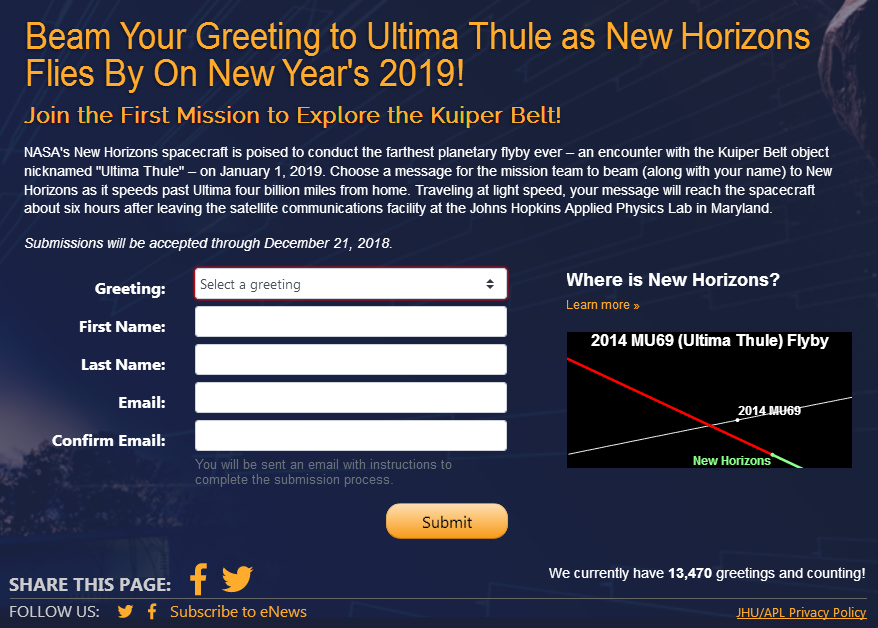 Поздравления с именами будут отправлены 1 января из центра связи Лаборатории прикладной физики (APL), откуда осуществляется управление аппаратом. Им потребуется 6 часов, чтобы достичь New Horizons. Регистрация имен продлится до 21 декабря 2018 г.