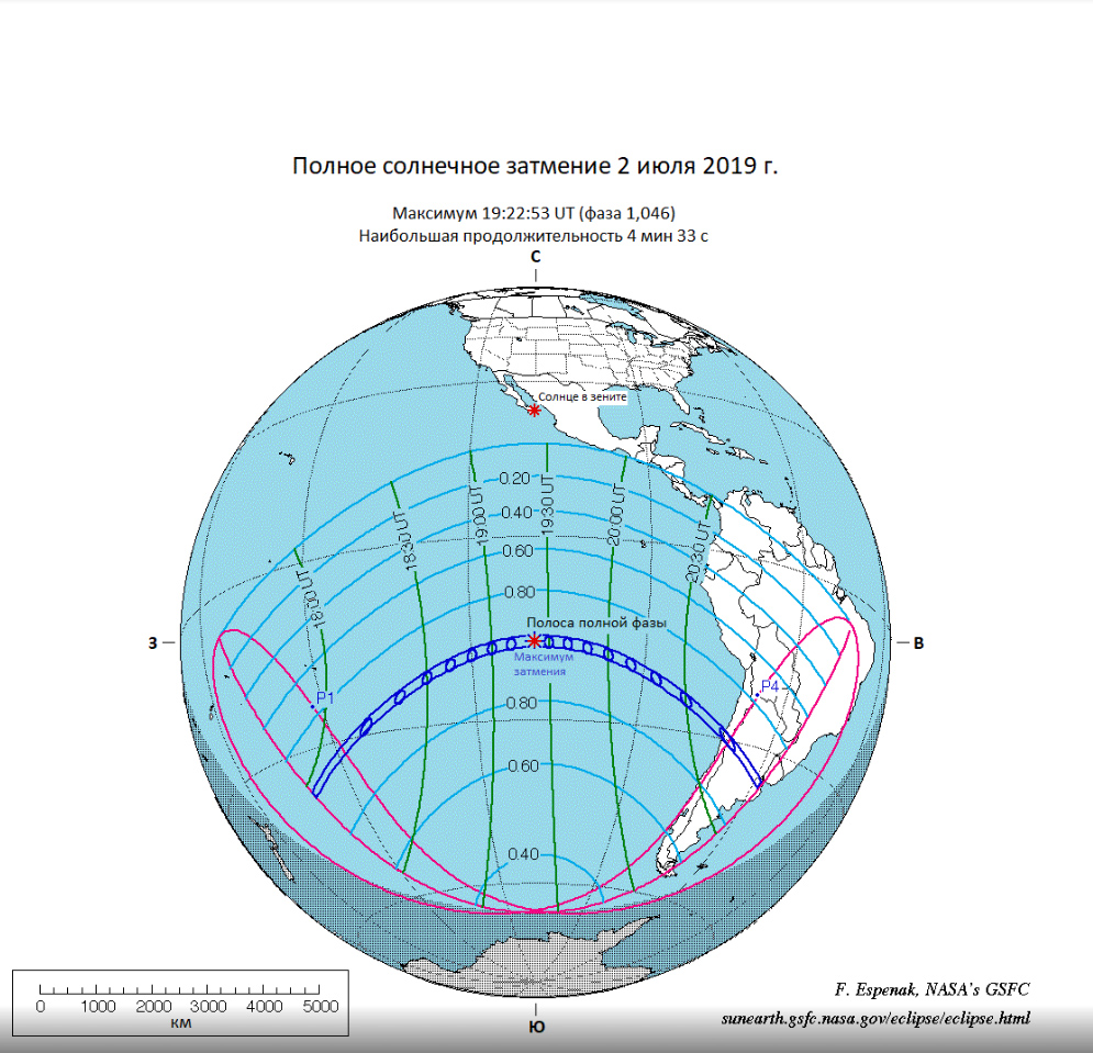 Центральная фаза полного солнечного затмения, которое произойдет 2 июля 2019 г., будет доступна наблюдениям на сравнительно небольшом по площади участке суши на территории Чили и Аргентины. Лунная тень в этот день коснется Земли в 18 часов 1 минуту 4 секунды по всемирному времени в 2200 км восточнее Северного острова Новой Зеландии и пройдет по югу Тихого океана, «накрыв» по пути небольшой атолл Оэно в группе островов Питкэрн. Максимальной фазы (1,023) затмение достигнет в 19:22:59 UT в точке с координатами 17°23,3′ ю.ш., 109°00′ з.д.; ее продолжительность в этой точке превысит 4 с половиной минуты.