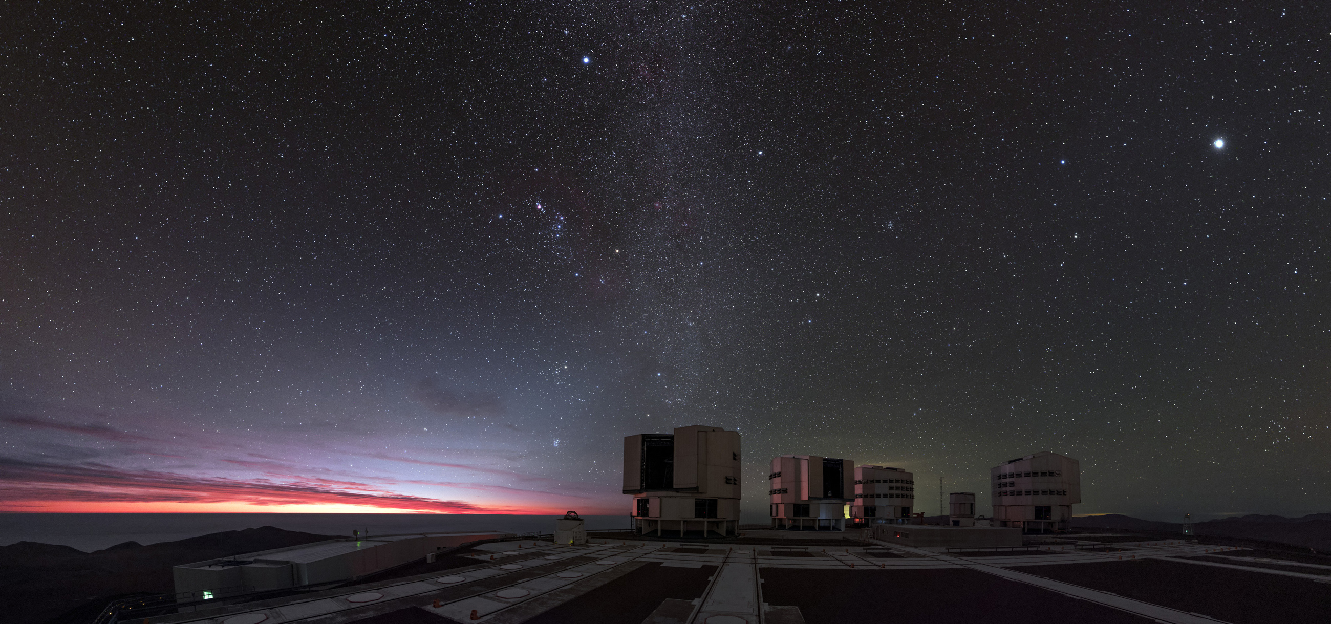 Левее и ниже Бетельгейзе можно разглядеть розоватое свечение Туманности Ориона. Еще ниже, прямо над маленьким открытым куполом, отверстие в котором направлено в ночное небо (под этим куполом находится один из вспомогательных «юнитов» VLT), видна тесная группа звезд. Это рассеянное звездное скопление Плеяды, также известное под названиями Стожары или Семь Сестер. Расстояние до него оценивается в 400-450 световых лет, его размер равен примерно 12 световым годам. В состав Плеяд входит не менее тысячи звездных систем, среди них преобладают горячие голубые звезды спектрального класса B. 14 из них на темном прозрачном небе люди с хорошим зрением могут увидеть невооруженным глазом.
