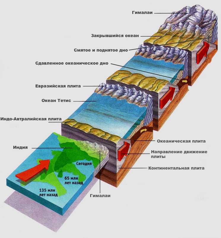 Глубоководный желоб пересек океан Тетис. По мере сближения Индии и Евразии океаническая кора стала погружаться внутрь желоба (зона субдукции). Донные отложения сдвинулись к краю плиты, и океан Тетис постепенно закрылся.