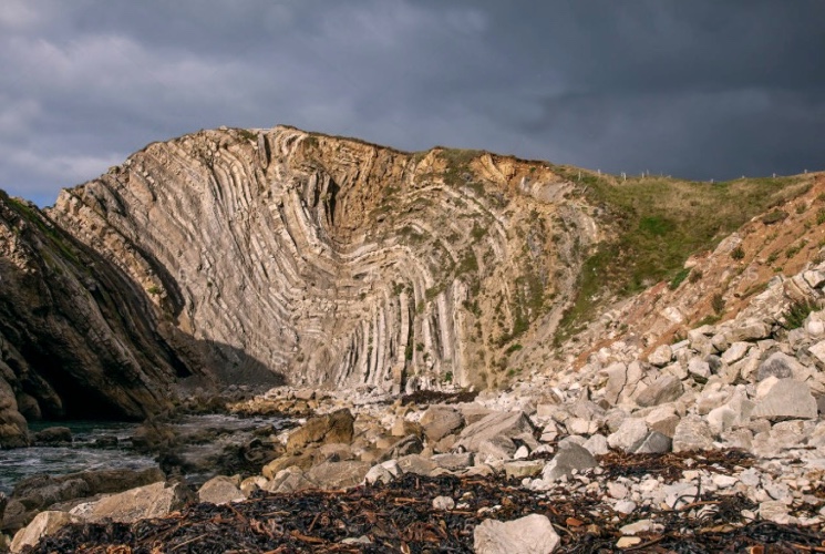 Этим породам из Дорсета, Англия, около 180 млн. лет. Складчатость возникала в результате столкновения Африканской плиты с Европой.