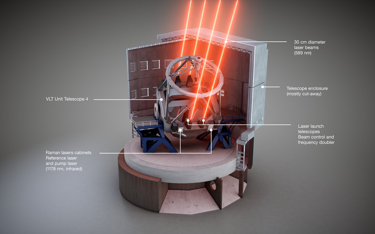 Очень большой телескоп Европейской Южной обсерватории (VLT ESO) выполнил первые наблюдения с новой системой адаптивной оптики в режиме «лазерной томографии». Полученные результаты весьма впечатляют. Благодаря новой технологии входящий в состав VLT 8-метровый телескоп UT4 смог получить изображения в видимом диапазоне с лучшей детализацией, чем у снимков космического телескопа Hubble.
