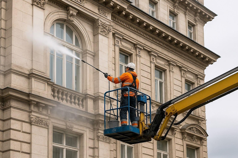 Для застарелой копоти, граффити, ржавчины фасадов используют мягкий бластинг или пескоструй с подбором фракции и расхода. Метод даёт высокую производительность, но требует экранирования и опытной бригады — особенно в плотной городской застройке. По прайсам 2025 года пескоструй — один из самых дорогих способов в расчёте на м².