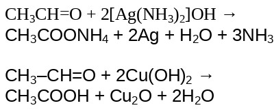 Альдегиды легко подвержены окислению благодаря их свойствам быть сильными восстановителями. В качестве окислителей для альдегидов можно выделить как и в предыдущих вариантах перманганат калия с дихроматом калия, а также преимущественно свойственных для альдегидов раствор гидроксиддиамина серебра — [Ag(NH3)2]OH и гидроксид меди — Cu(OH)2. Важным условием для протекания реакции окисления альдегидов является влияние температуры.