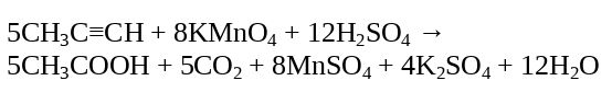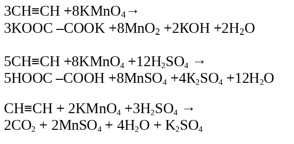 В отличие от алкенов, алкины окисляются в более агрессивной среде. Разрушение углеродной цепи происходит по тройной связи. Общим свойством с алкенами являются их восстановители в лице атомов углерода.