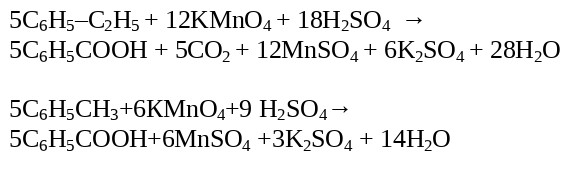 Даже в самых агрессивных условиях бензол не подвержен окислению. Однако гомологи бензола способны окисляться под воздействием раствора перманганата калия в нейтральной среде до образования бензоата калия.