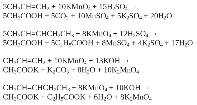 Агрессивные условия окисления приводят тому, что углеродная цепь разрушается по двойной связи с итоговыми продуктами образования в виде двух кислот. Причем если среда с повышенным содержанием щелочи образуется две соли. Также продуктами вследствие распада цепи углерода может образовываться кислота и диоксид углерода, а вот в условиях сильной щелочной среды — продуктами окислительной реакции выступают соли карбоната.