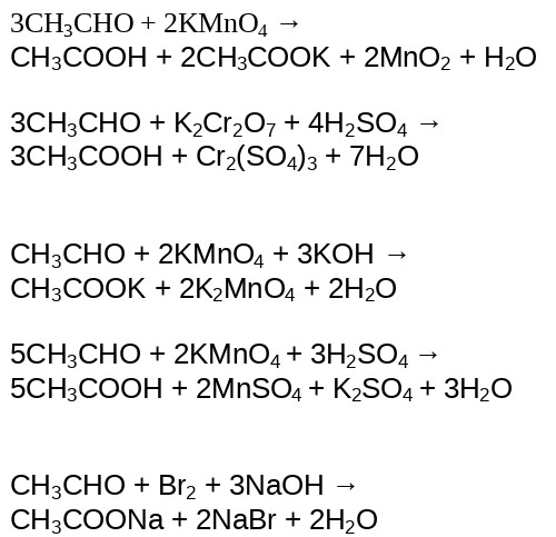 Альдегиды, в свою очередь образовавшиеся при окислении спиртов, далее могут окисляться до образования кислот. Это достигается путем окисления первичных спиртов дихроматом калия в кислотной среде при кипении альдегида, которые в свою очередь при испарении не успевают окисляться.