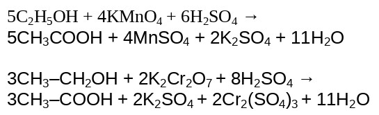 При условии избыточного присутствия таких окислителей, как перманганат калия (KMnO4) и дихромат калия (K2Cr2O7) практически в любых условиях первичные спирты способны окисляться с выделением карбоновых кислот, в вторичные спирты в свою очередь — кетонов, примеры реакций которых с продуктами образования рассмотрим ниже.