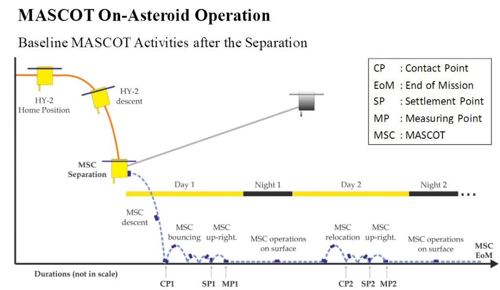 Уже в ближайшее время «Хаябуса-2» сбросит на поверхность Рюгу еще один аппарат — модуль MASCOT, разработанный Германским центром авиации и космонавтики (DLR) совместно с французским Национальным центром космических исследований (СNES). Он весит 10 кг и имеет размеры 30×30×20 см. Полезная нагрузка модуля состоит из 4 инструментов: микроскопа, камеры, радиометра и магнитометра.