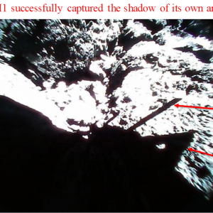 Изображение поверхности Рюгу. На нему видна тень от антенны микроровера. Источник: JAXA