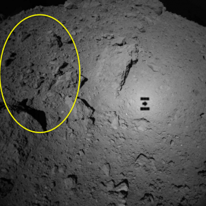 Тень от станции «Хаябуса-2» на поверхности Рюгу. Желтый круг обозначает место высадки микророверов. Источник: JAXA