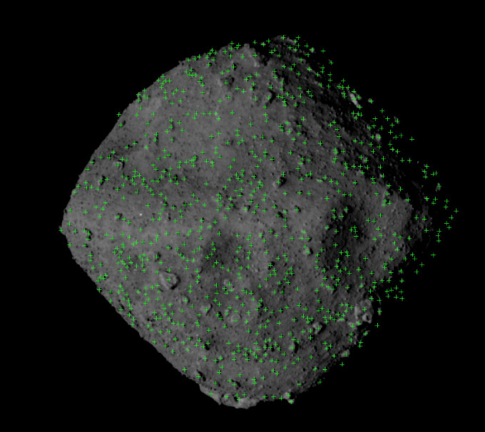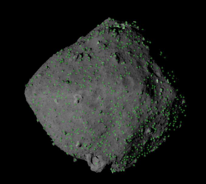 Распределение горных пород (зеленые крестики) на поверхности Рюгу. Источник: Kinki University / JAXA / Tokyo University / Kochi Univ. / Rikkyo University / Nagoya University / Chiba Institute of Technology / Meiji Univ. / Aizu Univ / AIST