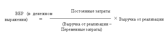Точка безубыточности в денежном выражении определяется следующей формулой: