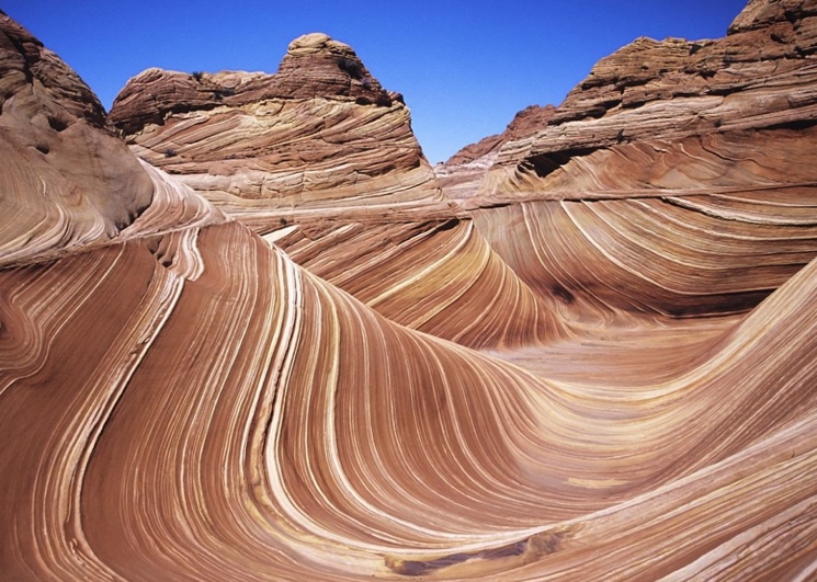 Разноцветные слои песчаника, истертого и отполированного ледниковой эрозией, образуют живописный полосчатый рисунок на пологих склонах холмов в штате Аризона, США. Прогибы в горной породе — результат воздействия ветра и воды.