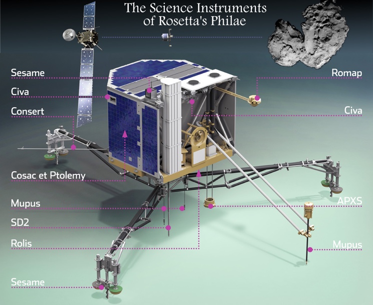 Зонд оборудован специальными инструментами и исследовательской аппаратурой, которые предназначаются для исследования ядра кометы. Внутренняя структура будет изучаться с помощью радиоволн, а микрокамеры, которые установлены на «Philae», позволят получить панорамные снимки.