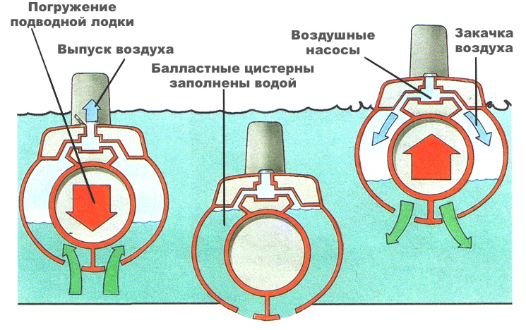 Подводная лодка состоит из водонипроницаемого корпуса, под обшивкой которого расположены цистерны с балластом. При заполненных водой цистернах лодка погружается. Под водой лодка находися во взвешенном состоянии — она не тонет и не всплывает. Когда необходимо всплыть, в балластные цистерны закачивается воздух, который вытесняет воду наружу.