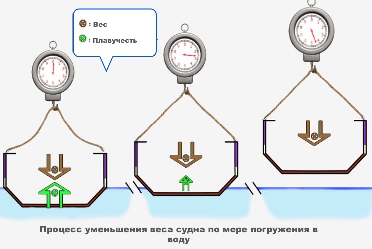 Плавающее тело, например судно, выталкивает объем воды из того пространства, ровно которое оно занимает вместо воды. Вес выталкиваемого объема воды равен весу судна. Плавучесть тела объясняется давлением воды.