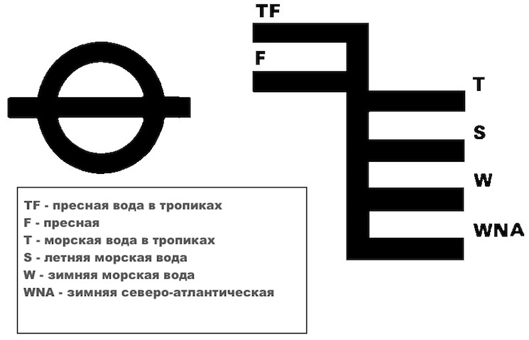 Отметки на борту судна показывают, сколько груза оно способно принять для безопасного плавания. Степень погруженности судна зависит, в частности, от плотности воды, в которой оно находится.