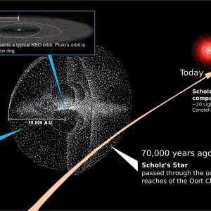 Сейчас звезда Шольца находится на расстоянии 22,1 светового года от Солнца. В ходе новых наблюдений астрономы также сумели уточнить скорость и направление ее движения, что, в свою очередь, позволило точнее рассчитать время и дистанцию сближения красного карлика с Солнечной системой. Это событие произошло 80,5 тыс. лет назад, когда звезда прошла на расстоянии 1,08 светового года (68,7 тыс. а.е.) от Солнца.